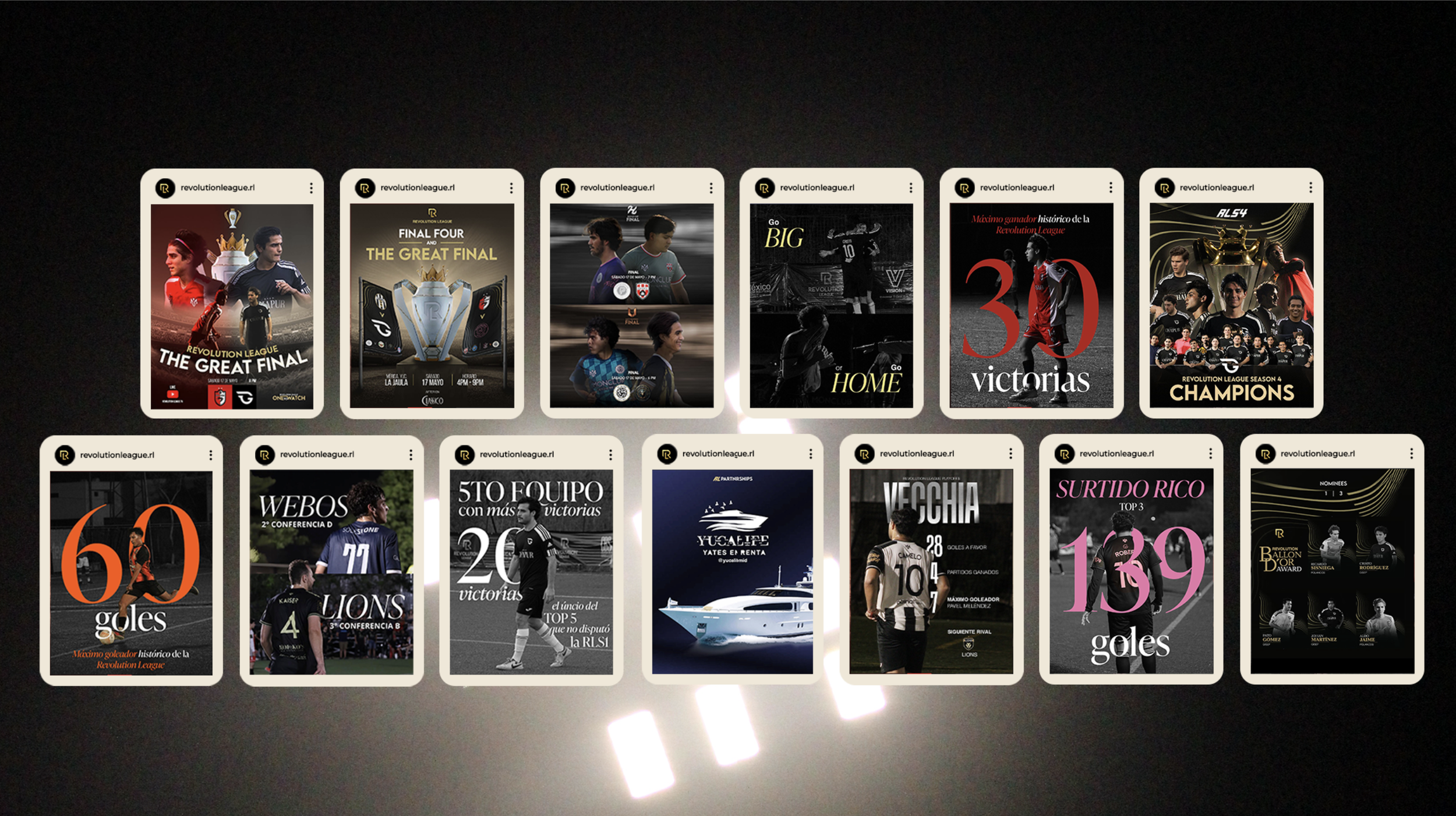 Revolution League is a university football league for which the comprehensive design of its social media presence was developed. The project ranged from strategic planning and content structuring to the final graphic execution. This work was complemented by art direction and photography, achieving a coherent, dynamic visual communication aligned with the league's essence.